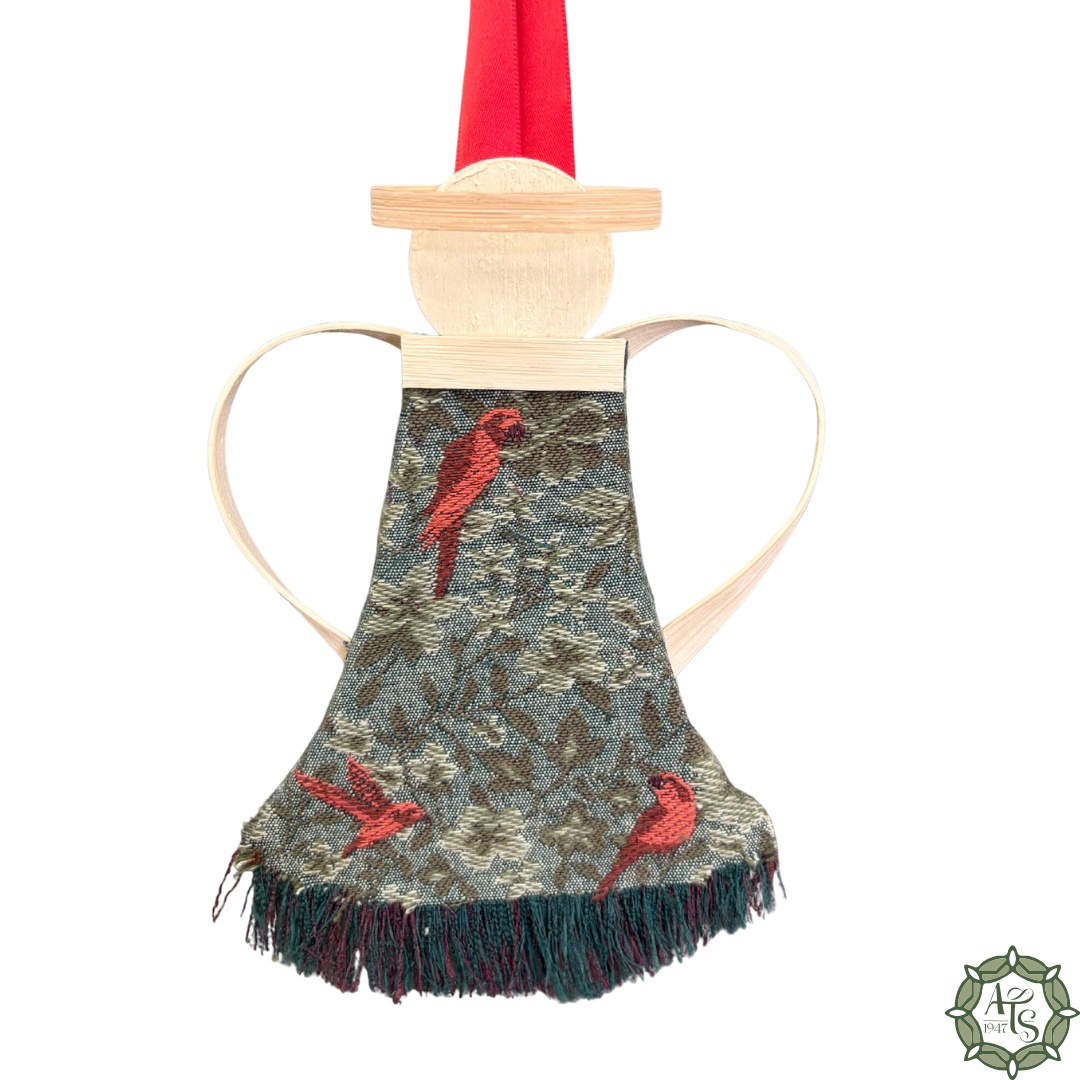Their delicate wings and halos are made using surplus snowflake material, while their dresses are crafted from this limited edition cardinal print. These handcrafted angels are sure to become a cherished part of your home decor for years to come.